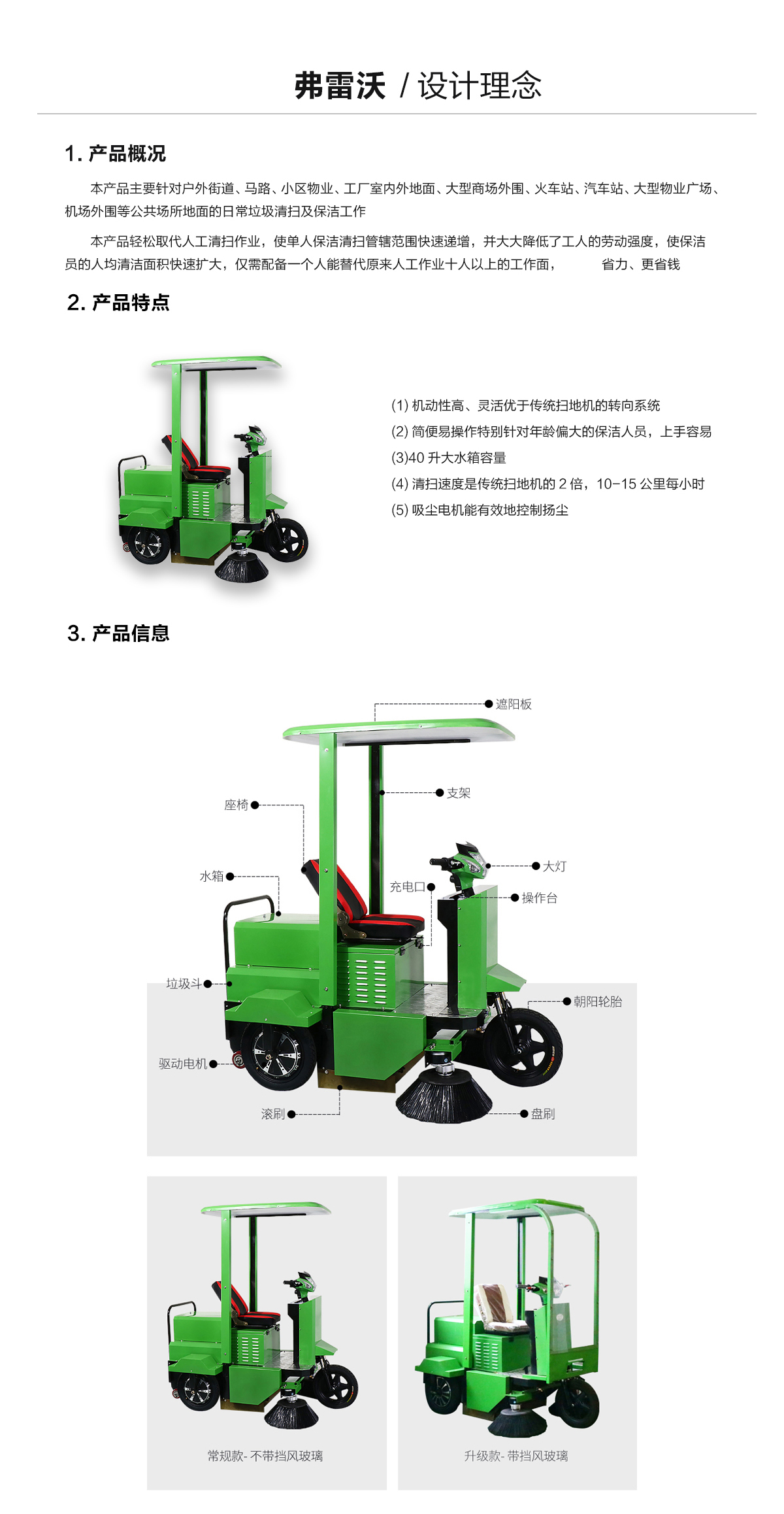 產(chǎn)品分類:駕駛式掃地機(jī)(可加裝擋風(fēng)玻璃)產(chǎn)品特點(diǎn):1、駕駛式掃地機(jī)FL1650配備出口型免維護(hù)電瓶,區(qū)別于市面上其他電動掃地機(jī),其智能型充電機(jī)能有效延長電瓶使用壽命,可使連續(xù)工作時(shí)間更長。2、操作簡單、便捷,對于年齡較大的保潔人員也可以無需通過特別培訓(xùn)即可上崗使用。3、雙邊刷設(shè)計(jì),顯著提升清掃效率,完成1000㎡的地面清掃工作僅需5分鐘。4、配備優(yōu)良吸塵電機(jī)和曬水系統(tǒng),能夠在清掃地面灰塵時(shí)灑水,有效避免揚(yáng)塵的產(chǎn)生。適用環(huán)境:戶外街道、小區(qū)物業(yè)、工廠車間、商場、車間、機(jī)場、學(xué)校、醫(yī)院、公園、廣場等地。