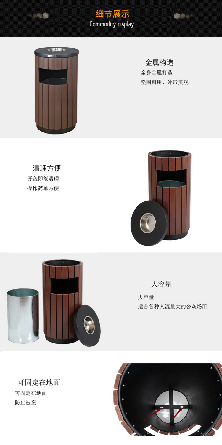 此款垃圾桶新款上市,做工精美,款式新穎,外觀自然簡樸,采用特別的防銹處理,戶外漆噴涂,防腐、防日光照射,經久耐用,做工精美,質量有保證。整體圓型設計,頂部配備煙灰缸,側面投口更方便,配備優(yōu)良加厚內桶。適用于:各銀行、車站、學校、醫(yī)院、郵局、劇院、空港、機場、地鐵、商場超市,展覽展示中心、酒店、俱樂部、會所、商務樓宇等。